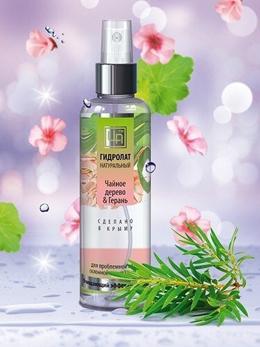 Гидролат — водный раствор компонентов эфирных масел чайного дерева, герани и лимона, являющийся продуктом паровой дистилляции. Повышает защитные функции кожи, устраняет воспаления и угревую сыпь, обладает антибактериальными свойствами, ускоряет заживление. Укрепляет волосы, делает их менее жирными, придает здоровый блеск, борется с перхотью. Оказывает ароматерапевтическое действие: чайное дерево снимает нервное напряжение, герань – эффективный антидепрессант, лимон – сильнейший адаптоген.